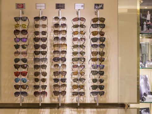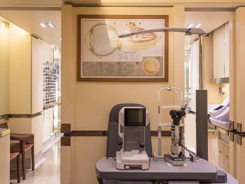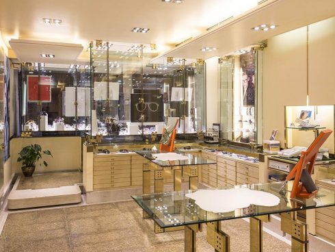 The restoration included two big windows leading into an elegant shop furnished with brass and marble. The architectural subdivision of the rooms was created to obtain adjoining spaces while maintaining individual areas for sales, laboratory, and refraction.